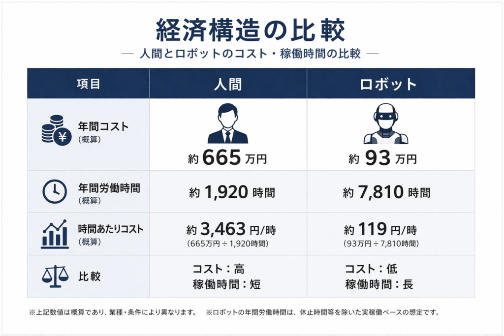 人間とロボットのコストおよび稼働時間において、構造的な差が顕在化している。